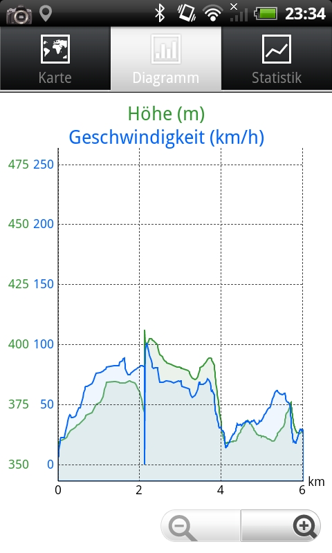 Das Messgerät war ein in den Ruhestand geschicktes Android Smartphone HTC Desire. Die Messung wurde mit der App "MyTracks" aufgezeichnet.