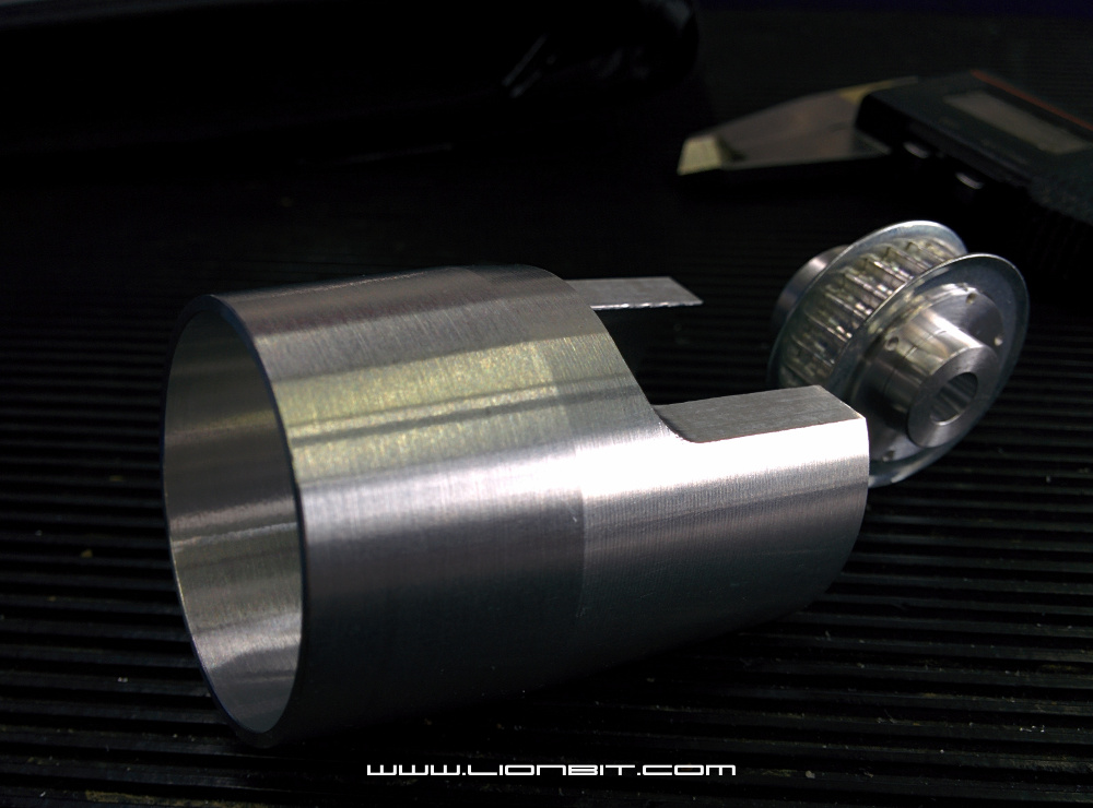 Hier habe ich lange hin und her überlegt ob es nur Alu oder Alu mit Carbon-Seitenplatten werden soll. Ich habe mich dann doch für die Aufwendigere aber kompaktere, vermutlich auch leichtere und stabilere Variante entschieden und es wurde ein Heckrotorgehäuse aus Aluminium und aus einem Stück. Aufwendig war die Herstellung schon von Anfang an, denn das gute 7075 Aluminium habe ich nur als Plattenmaterial und nicht als Rundmaterial wie ich es dafür gebraucht hätte. Aber das macht nichts, es ist dann am Ende trotzdem rund geworden ;-) Es musste sehr viel Material weichen, ein Berg aus Spänen wuchs in der Drehmaschine denn es war als Rohling ein dünnes, gestuftes Rohr. Erst einen Tag später ging es an der Fräsmaschine weiter wo die Öffnung für das Heckzahnriemenrad und noch ein Paar andere Flächen gefräst wurden.