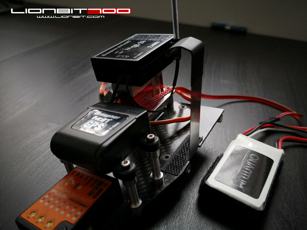 Plattform mit GPS und StützakkuDurch den kleinen LiPo entstand auf der Plattform endlich deutlich mehr Platz und dieser wird für einen HoTT GPS-Sensor genutzt. Soweit die Theorie...