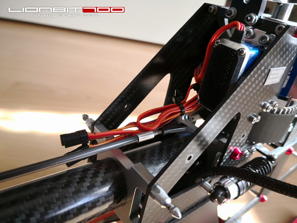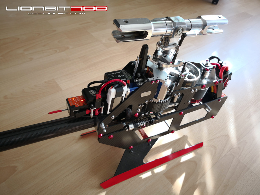 LionBit 700 von linksDer Heli ist fertig.Rein optisch gefällt mir die Sache jetzt endlich, der Test steht aber noch wegen schlechtem Wetter aus.